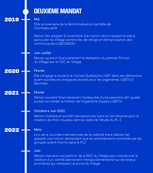 Un projet phare dont je suis particulièrement fière : Espace LGBTQ+, que j’ai soutenu de sa création à son déploiement en passant par l’embauche d’agent-e de développement, l’autofinancement, l’acquisition, et exerçant une pression constante sur le gouvernement.